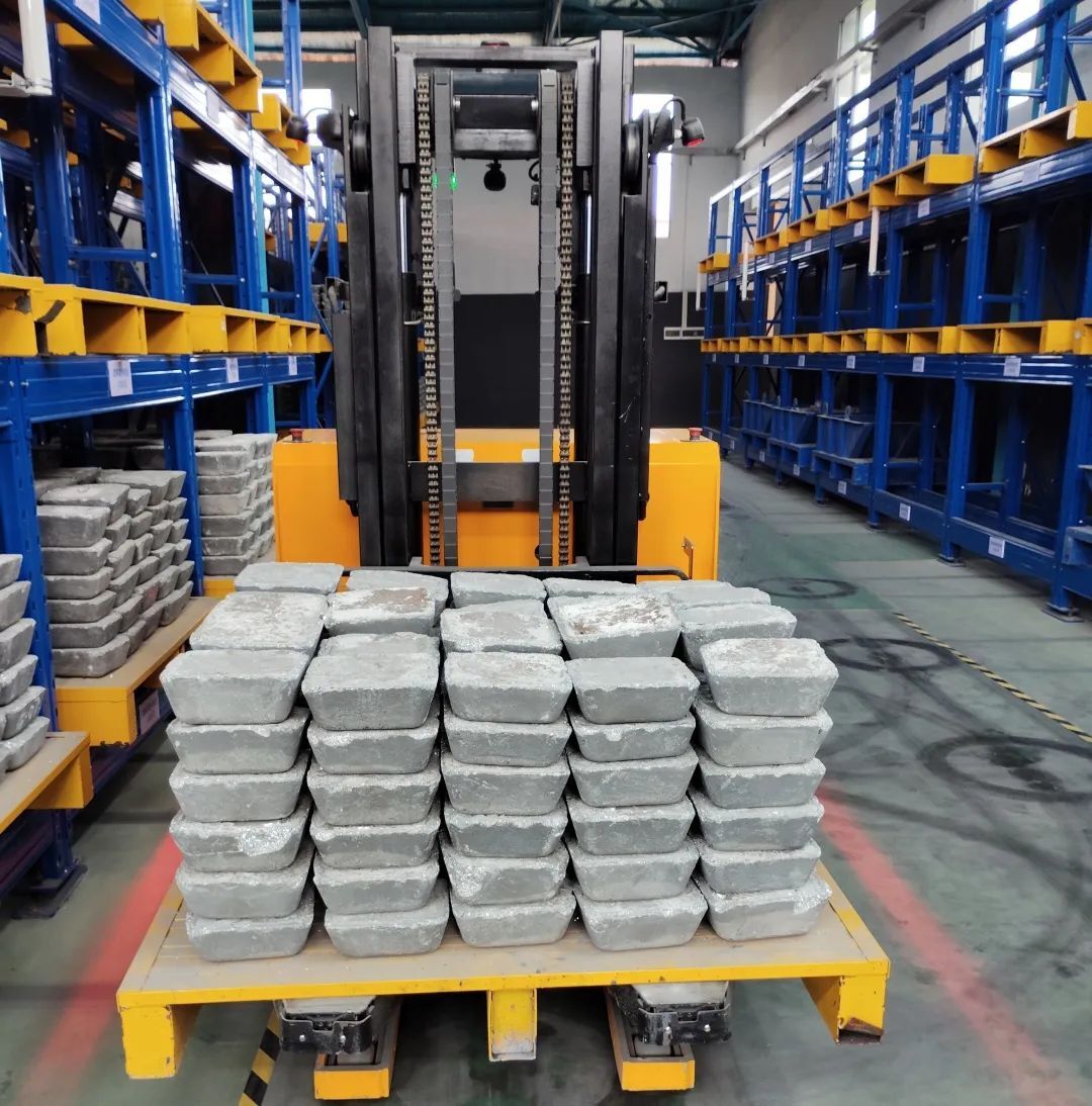 AGV叉車正在轉(zhuǎn)運(yùn)銻錠